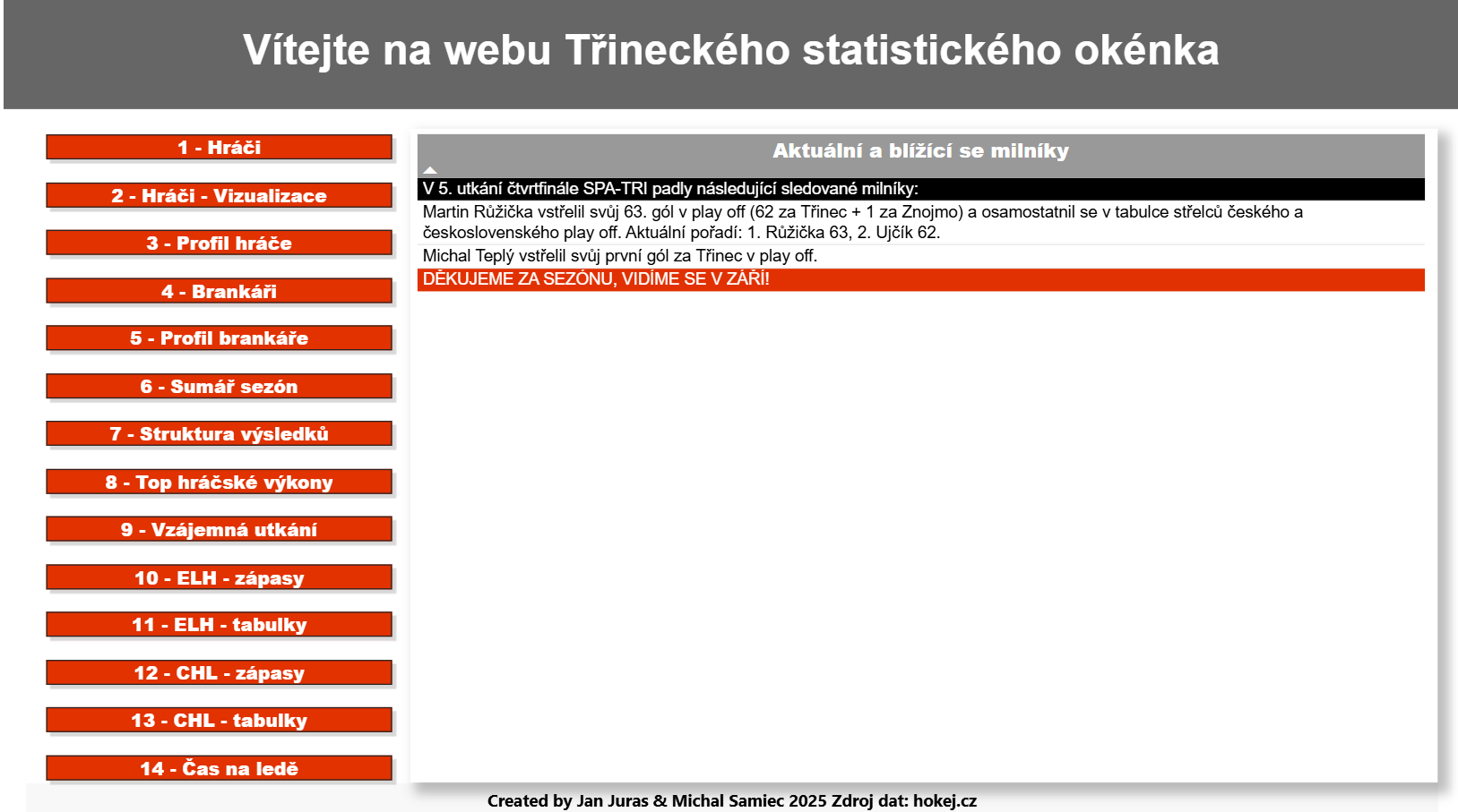 Pokud najdete chybu, máte dotaz nebo byste chtěli cokoliv z Třineckého statistického okénka podrobněji vysvětlit, neváhejte nás kontaktovat, ideálně na emailu michal.samiec@hcocelari.cz