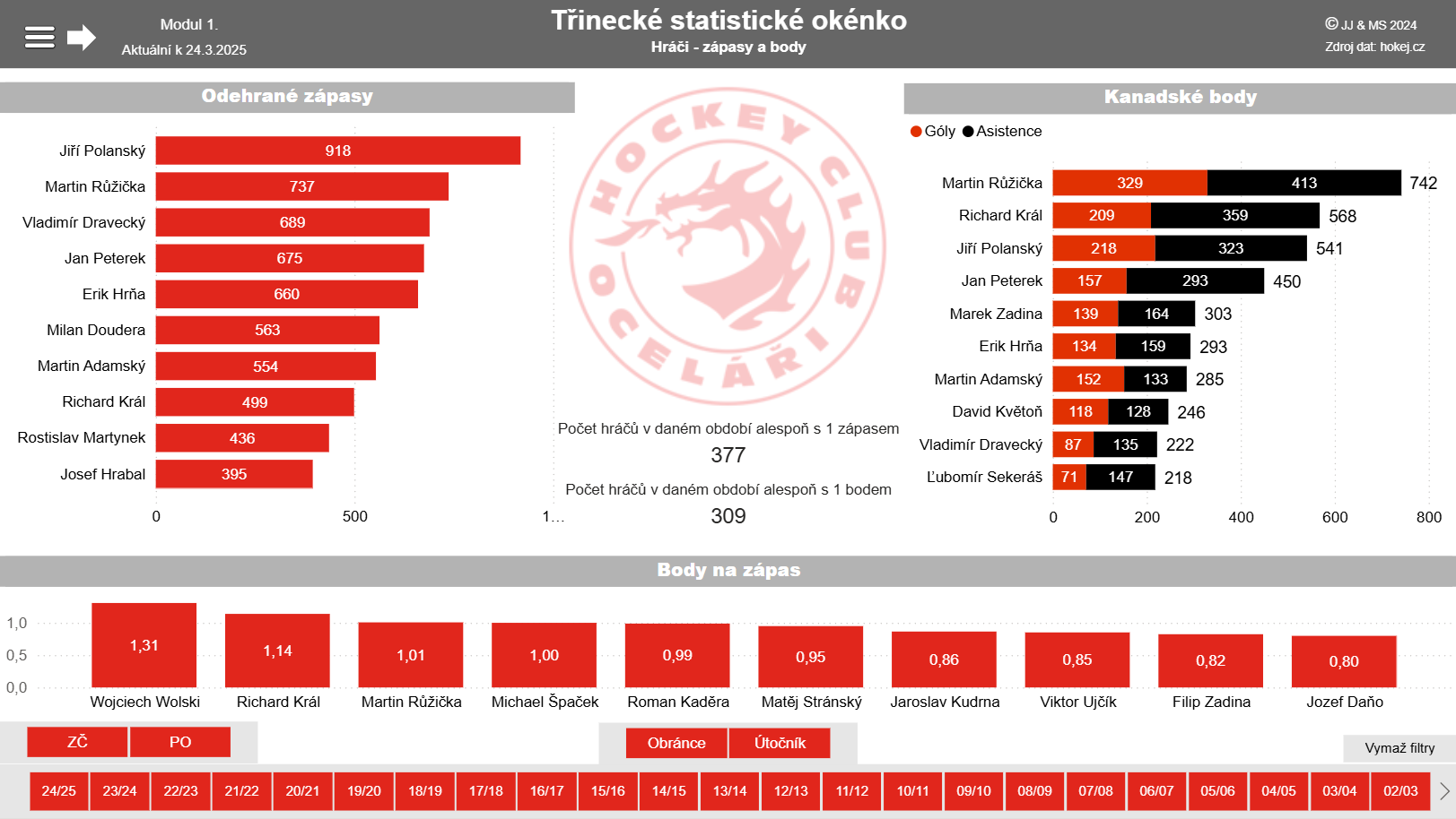 Historické klubové statistiky na jednom místě! Třinecké statistické okénko přináší zajímavé historické statistické údaje za období extraligové účasti třineckých Ocelářů, tedy od podzimu roku 1995. Třinecké statistické okénko, na něž naleznete proklik z úvodní stránky klubového webu Ocelářů, běží na doméně statistiky.hcocelari.cz. Níže přinášíme představení jednotlivých modulů webu a informace k tomu, jak se na nich orientovat. Zdrojem všech dat jsou oficiální statistiky hokej.cz, příp. statistiky Champions Hockey League a vlastní sesbíraná data.