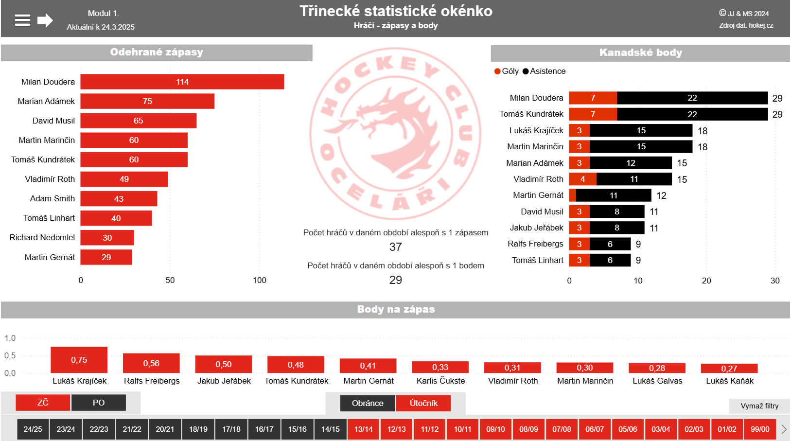 Pokud bychom použili stejný příklad jako u modulu s daty za vyřazovací boje – i zde je totiž možné libovolně aplikovat díky tlačítkům dole filtry na pozice, fáze sezóny i jednotlivé ročníky –, jsou výrazně odskočeni a vpravo se překrývají Tomáš Kundrátek a Milan Doudera.