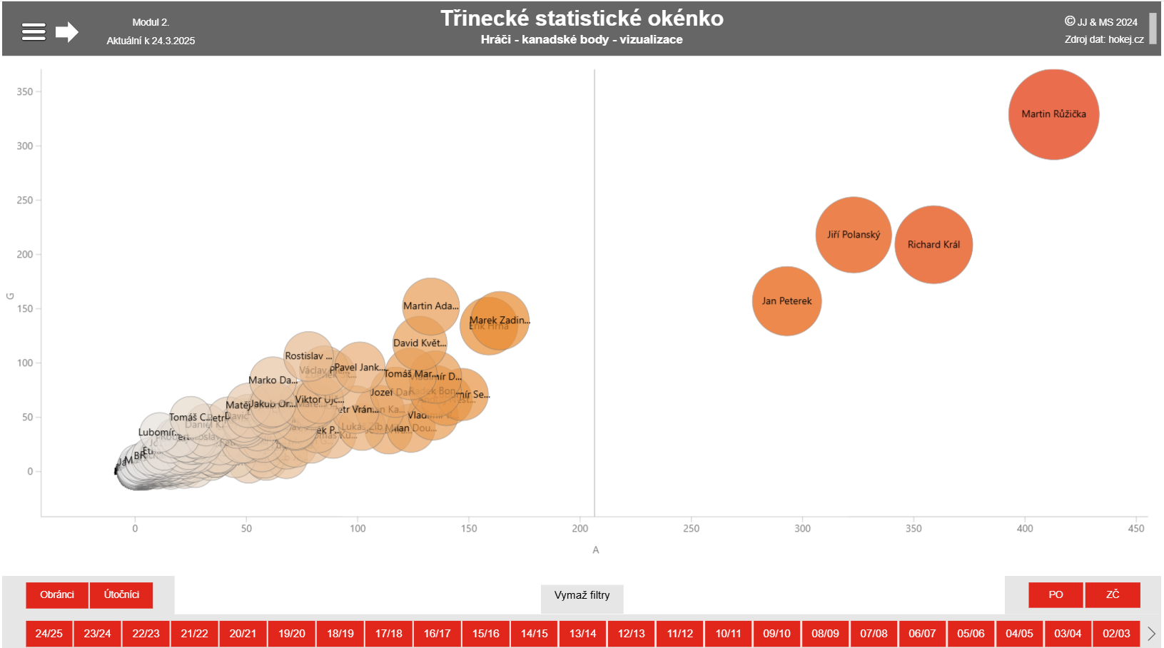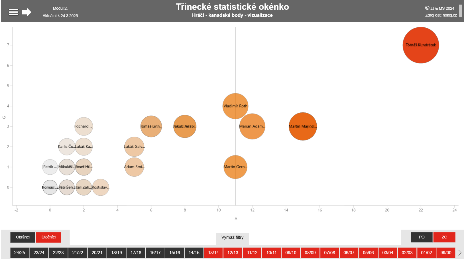 Data ve druhém modulu se významově týkají podobného tématu jako data v předchozím. Graficky je znázorněno, jak si jednotliví hráči, kteří kdy za Třinec extraligu hráli a získali nějaké kanadské body, vedou v kontextu ostatních hráčů. Na svislé ose jsou vyznačeny branky, na vodorovné asistence. Nijak nepřekvapí, že čtyři nejproduktivnější hráči – Martin Růžička, Richard Král, Jiří Polanský a Jan Peterek – jsou odskočení (zde i vizuálně).