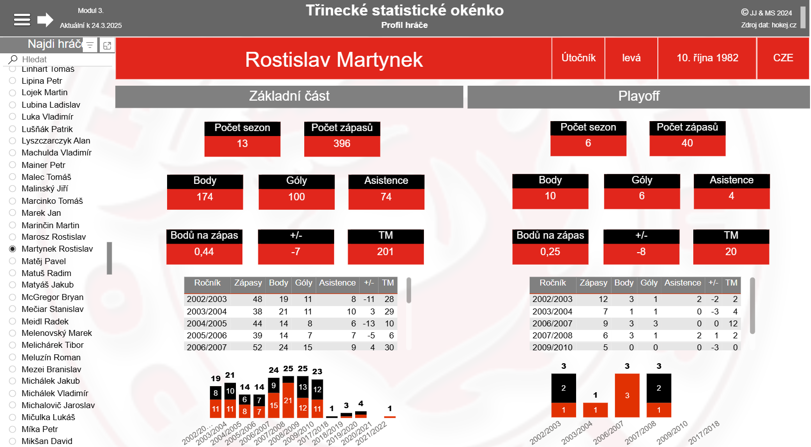 Třetí modul je jakýmsi telefonním seznamem všech hráčů, kteří kdy oblékli dres extraligového Třince. Hráče je možné vyhledat vpisem do políčka „Hledat“ vlevo nahoře, nebo v zašrktávacím seznamu níže.