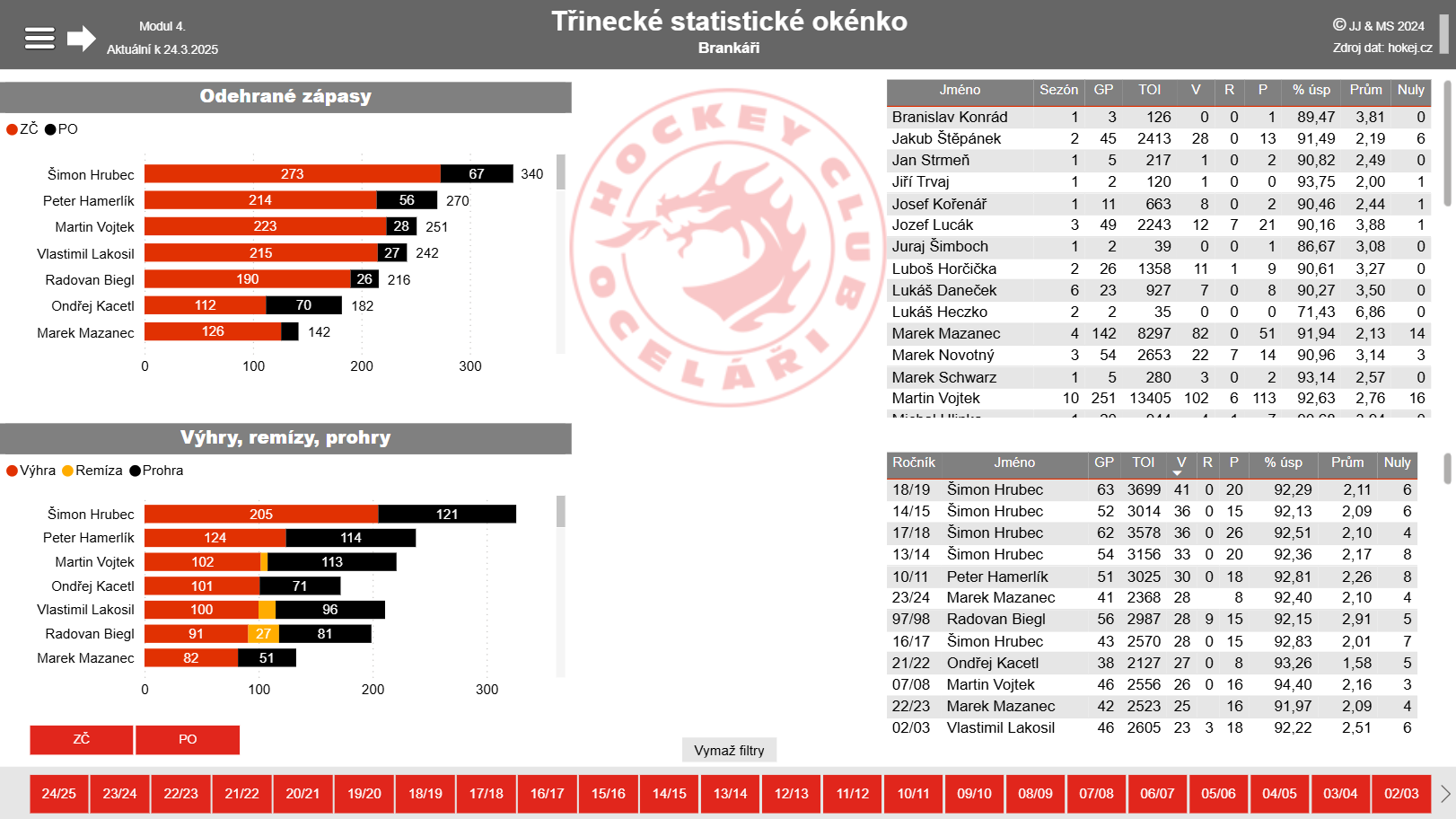 Čtvrtý modul je plně věnovaný brankářům. Zde jsou v levé části stránky graficky zobrazené odehrané zápasy včetně rozdělení dle jednotlivé fáze sezóny a také bilance brankářů dle vychytaných výher, proher, příp. remíz. V pravé části stránky jsou pak tabulková data – souhrnné statistiky za celou dobu, kdy daný brankář v Třinci působil (příp. za vyfiltrované období), včetně označení počtu odehraných sezón, a dole pak statistiky za jednotlivé sezóny. To, jaká data jsou zobrazena, je opět možné ovlivnit prostřednictvím filtrů v dolní části stránky (výběr základní část/play off a konkrétní sezóny).