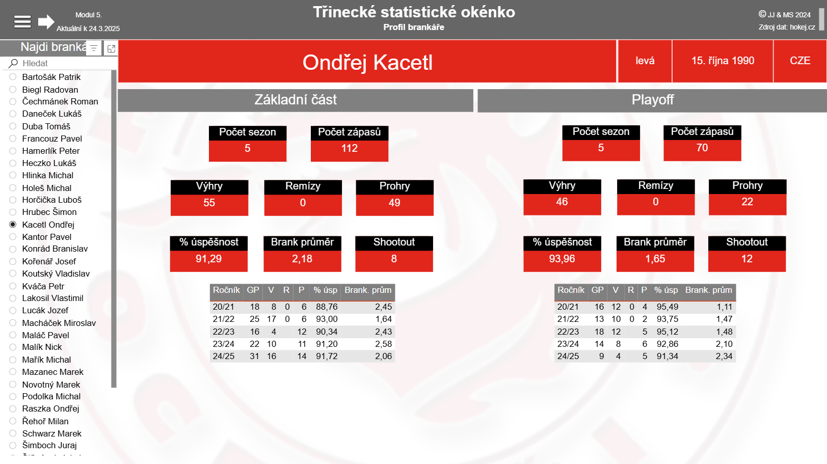 Modul pět funguje totožně jako modul tři, ale nevybírá se mezi hráči v poli, ale mezi brankáři. Po výběru konkrétního brankáře se zobrazí jeho statistiky s rozdělením na základní část a play off včetně grafické vizualizace.