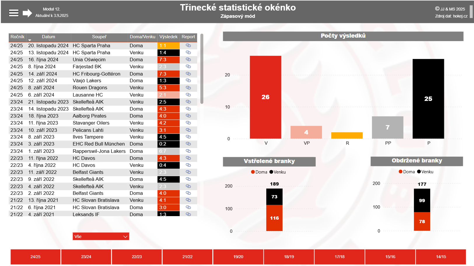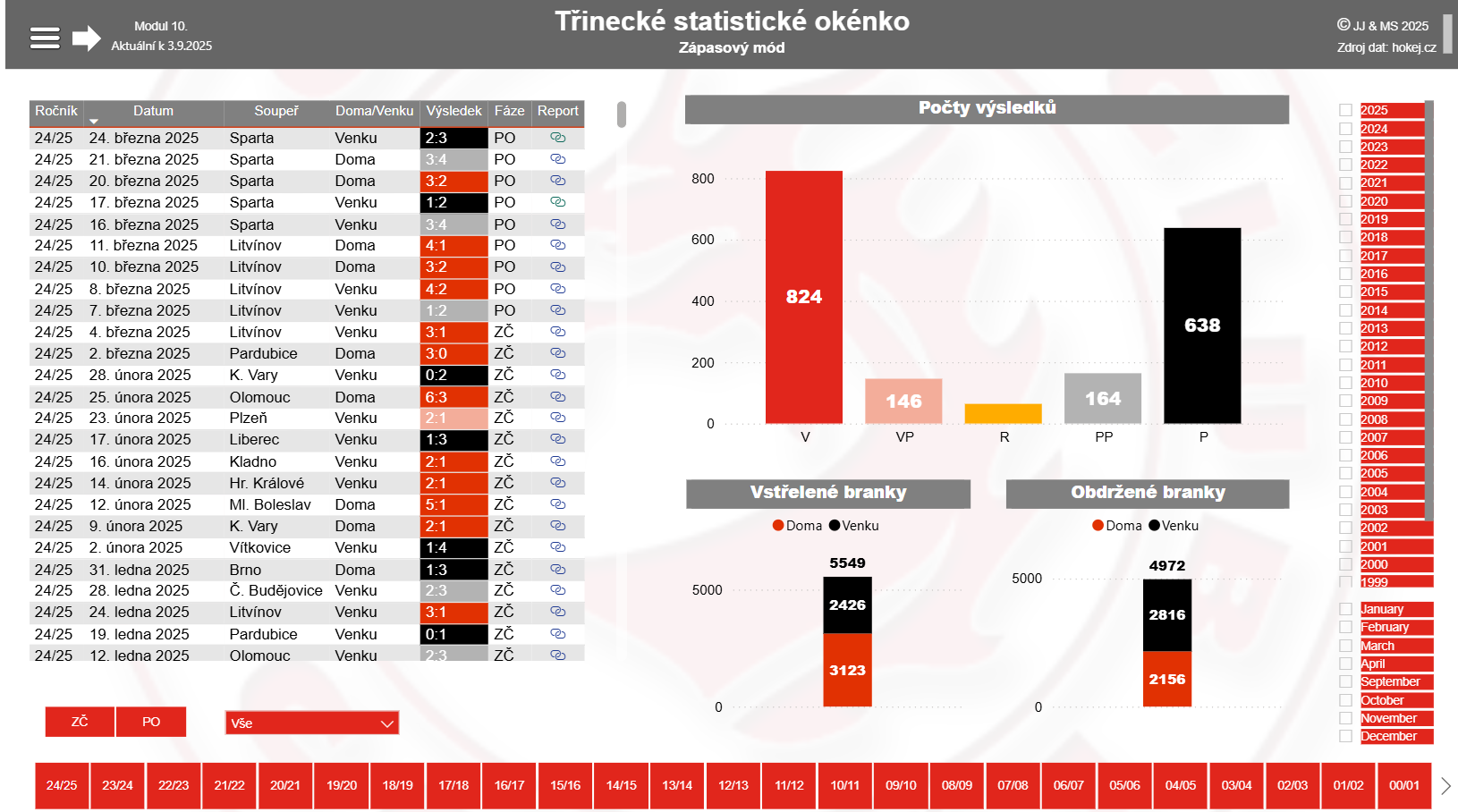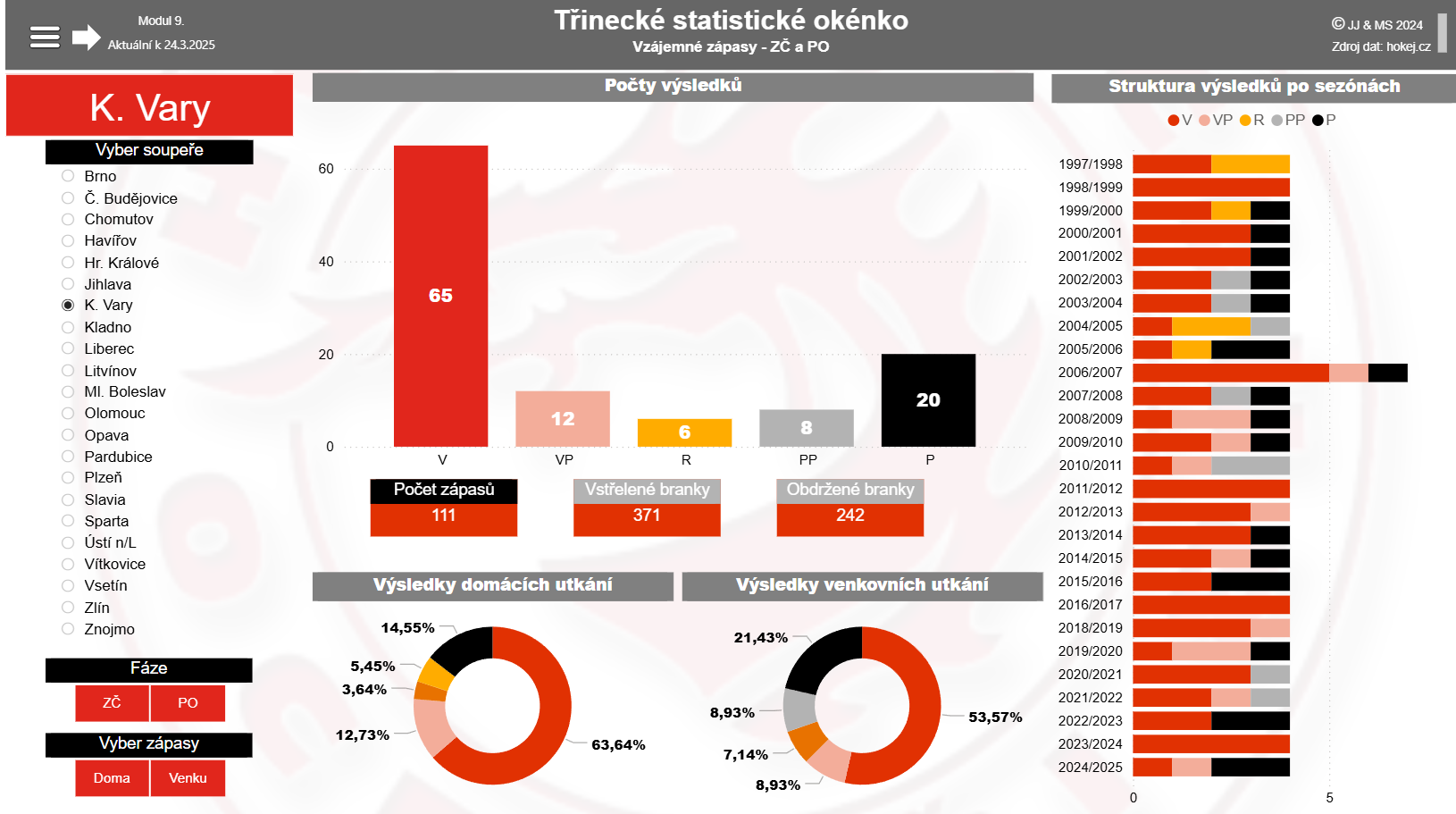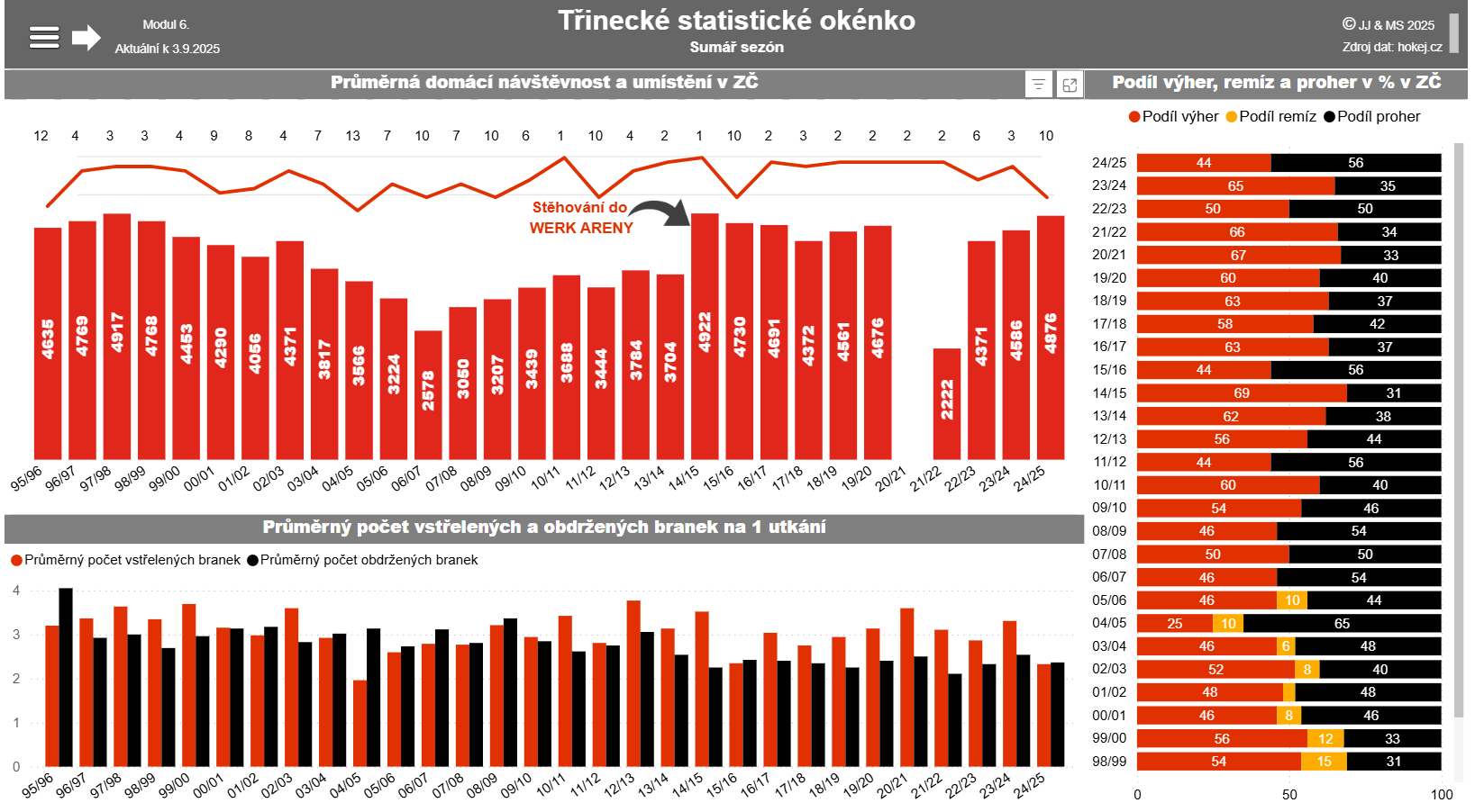 Modul číslo šest se věnuje týmovým statistikám. Můžeme jej rozdělit do tří částí. V levé horní části je na jednom grafu znázorněn vývoj umístění týmu v základní části a k tomu pro srovnání vývoj průměrné návštěvnosti na domácích utkáních základní části. Je označena sezóna 2014/15, kdy došlo ke stěhování do zbrusu nové Werk areny na Frýdecké ulici a zároveň mezisezónně došlo k třetinovému nárůstu v průměrných domácích návštěvách (z 3704 na 4922 diváků). Je také vidět, že v předpandemickém období atraktivní prostředí nové haly lákalo podstatně víc než v předchozích sezónách. V nové aréně bývalo v těchto sezónách zaplněno až devět desetin míst. Sezóna 2024/25 ale znovu nabídla vysoké domácí návštěvy – průměrně přišlo do haly 4876 diváků, což byla druhá nejvyšší průměrná návštěva v nové aréně a třetí nejvyšší průměrná návštěva za tři dekády v extralize.