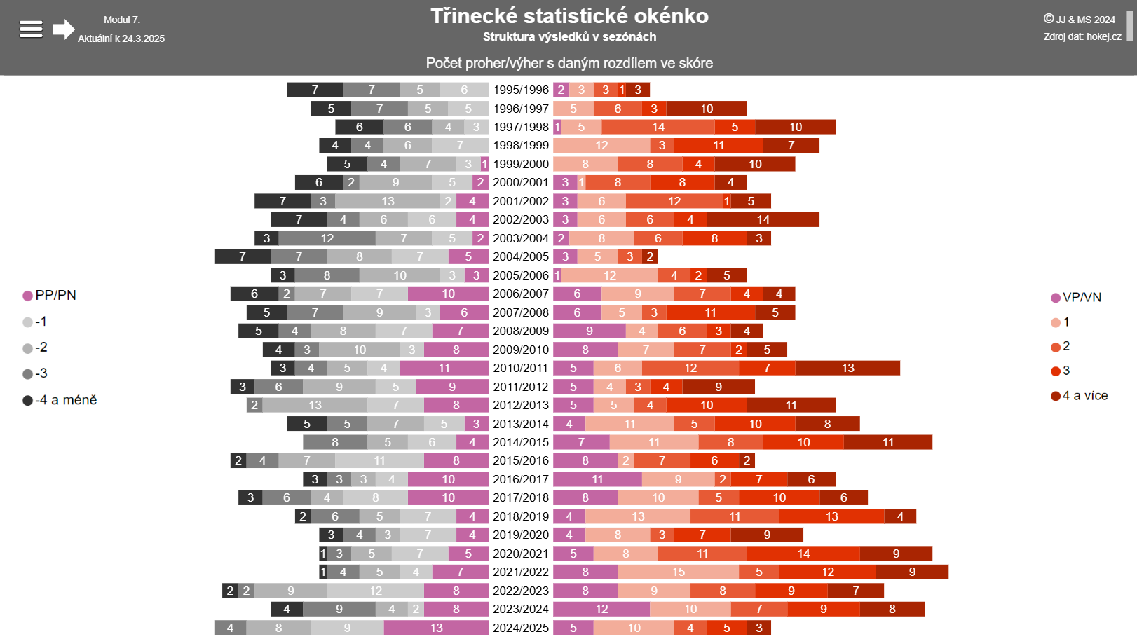 Tento modul graficky znázorňuje výsledky v jednotlivých sezónách rozdělené do kategorií podle brankového rozdílu. Uprostřed ve svislé ose jsou popisky jednotlivých sezón, směrem doprava jsou znázorněny vodorovnými pruhy výhry a doleva porážky. Fialovou barvou jsou vizualizovány výhry a prohry po prodloužení či nájezdech, na škále od šedé po černou porážky (odstupňované dle brankového rozdílu) a na škále od růžové po tmavě červenou vítězství (rovněž odstupňované). Jedná se o zápasy pouze v základní části.
