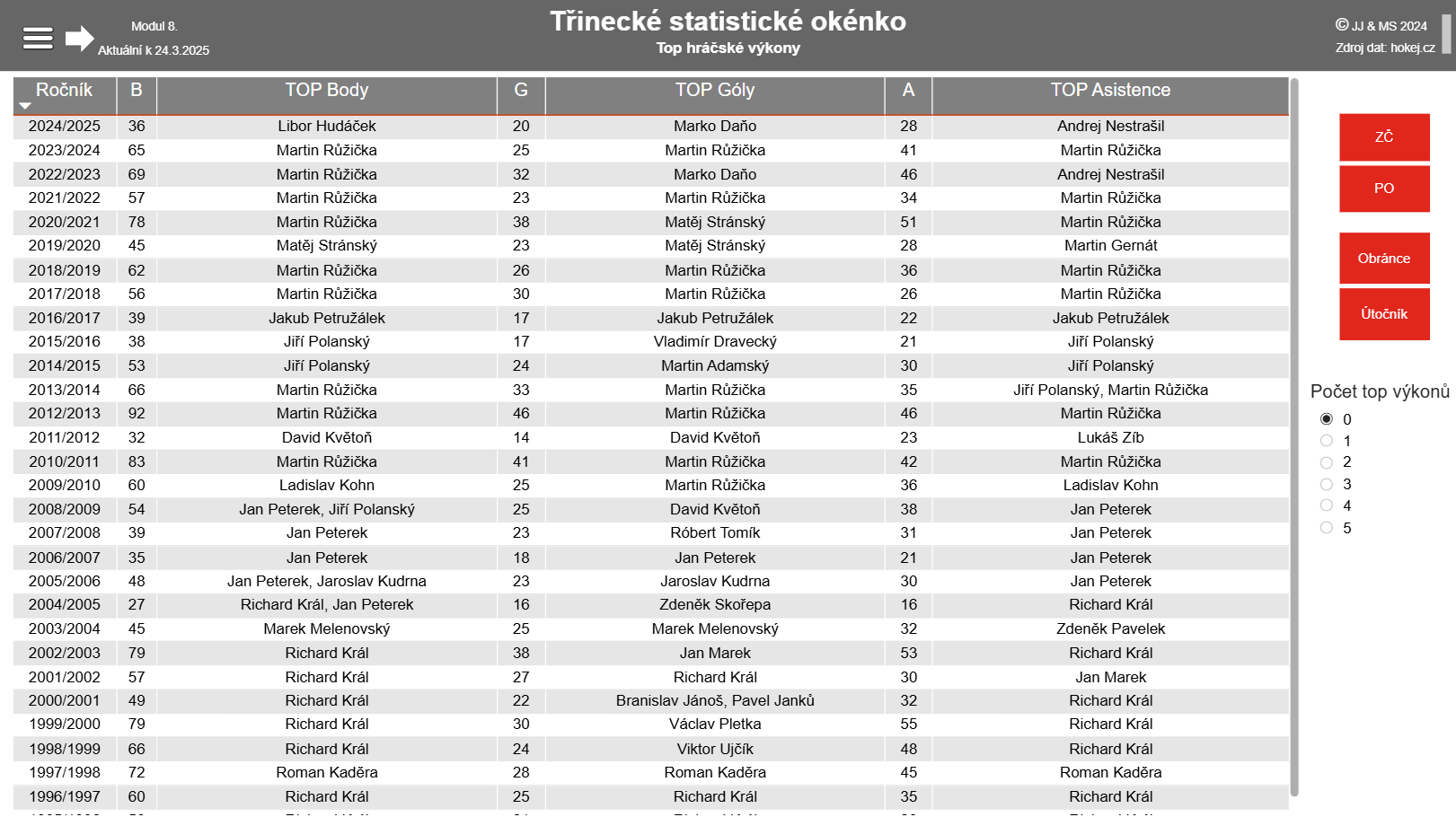 Modul je možné ovládat prostřednictvím filtrů. Je možné vybrat například pouze výkony v základní části, pouze obránce a je možné nechat si vyznačit x nejlepším výkonů napříč sezónami (až do pěti). Na uvedeném příkladu jsou vybrány výkony obránců v základní části a napříč jednotlivými ročníky jsou vybrány tři nejlepší výkony v každé kategorii.