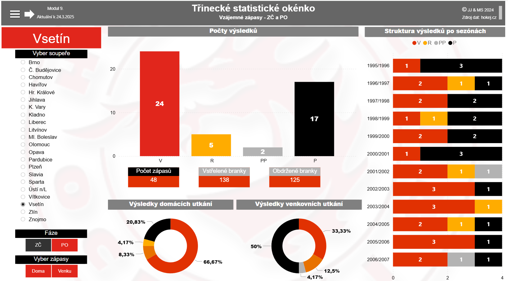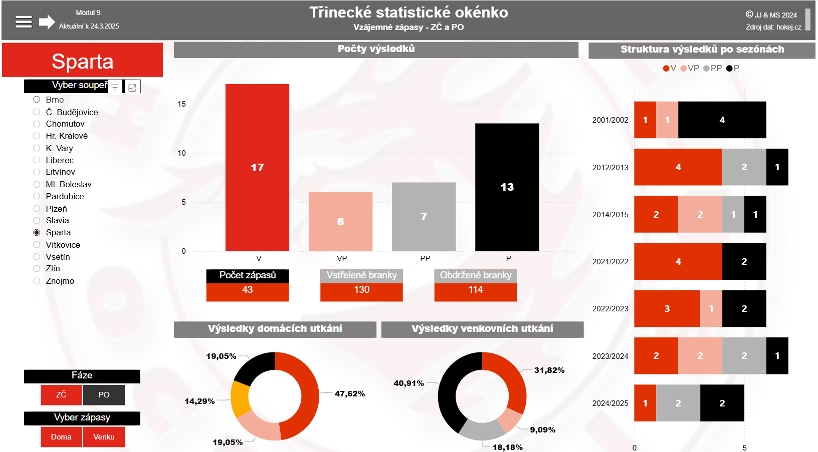 Filtrace dat v tomto modulu spočívá ve výběru soupeře, fáze sezóny, pro niž chci zobrazit data (když tento filtr nepoužijeme, jsou znázorněna data v součtu obou fází sezóny), a ve výběru místa zápasů, tzn. zda se mají propočítat domácí či venkovní zápasy (opět při absenci aplikace filtru se zobrazí data za všechny zápasy). Pojďme si demonstrovat, jak může vypadat výběr dat – vybrali jsme vzájemnou bilanci se Vsetínem v zápasech základní části doma i venku, s Karlovými Vary v součtu základní části i play off a také se Spartou v play off, vždy na domácím i venkovním ledě. Ve všech grafech (sloupcový s počty výsledků, kruhový s domácí/venkovní bilancí i v horizontálních pruhový dle sezón) jsou pro názornost užívány stejné barvy – oranžová pro vítězné zápasy, šedá pro porážky v prodloužení/nájezdech a černá pro porážky.