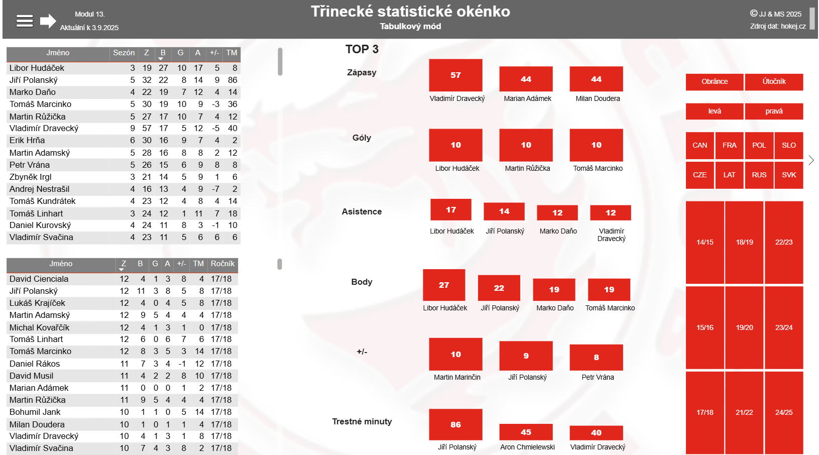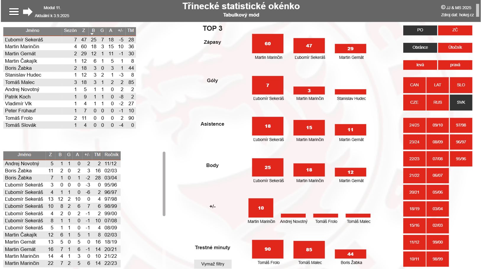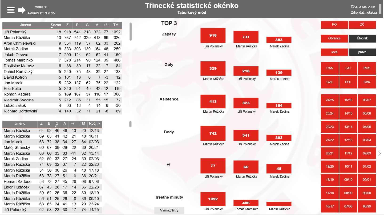 Jedenáctý modul obsahuje tabulková data. Tato část je možná nejvíce podobná způsobu práce se statistikami a daty na různých známých hokejových portálech. V levé části obrazovky jsou pod sebou dvě tabulková pole. Pokud není aplikován žádný filtr, pak horní pole obsahuje souhrnné statistiky za jednotlivé hráče, kteří kdy v extralize nastoupili za Třinec. Každý hráč je tedy v tomto pořadí jednou. Při seřazení tabulky dle sloupce „Z“ se zobrazí pořadí hráčů dle počtu odehraných zápasů za Třinec. V dolním tabulkovém poli je pak každý hráč, který nastoupil za Třinec, v tabulce tolikrát, do kolika sezón zasáhl. Tedy Adam Smith tam je třikrát, protože zasáhl do tří extraligových sezón. Adam Rufer pětkrát, protože nastupoval v pěti sezónách atd. Při seřazení této tabulky, např. podle sloupce „B“, získáme pořadí hráčů podle nejlepšího sezónního výkonu. V horní souhrnné tabulce je dále sloupec "Sezón", který udává, kolik sezón daný hráč v Třinci odehrál.