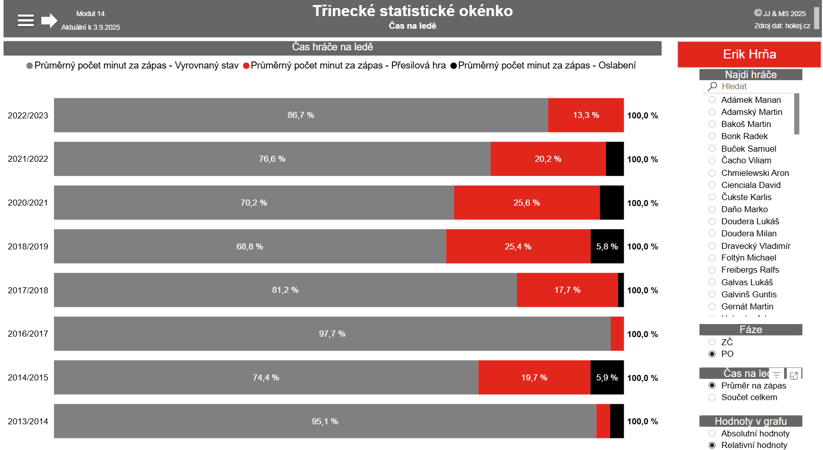 Prostřednictvím aplikace filtrů je možné vybrat jiná data. Je možné v roletce v pravé části obrazovky vybrat jiného hráče (pro náš příklad jsme si vybrali Erika Hrňu). Je možné vybrat data v play off, průměrný čas na ledě místo absolutních hodnot (v minutách). Případně místo absolutních hodnot lze též vybrat relativní hodnoty, kdy je čas strávený na ledě rozdělen poměrově dle herních situací.